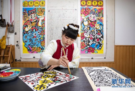 孫博秀芳在成都市青羊小區(qū)的工作室里創(chuàng)作以牛為題材的成都年畫(2月2日攝)。 新華社記者 江宏景 攝