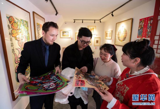 2月12日,在成都市人民公園,孫博秀芳(右一)在向購買成都年畫的觀眾講解作品寓意。 新華社記者 江宏景 攝