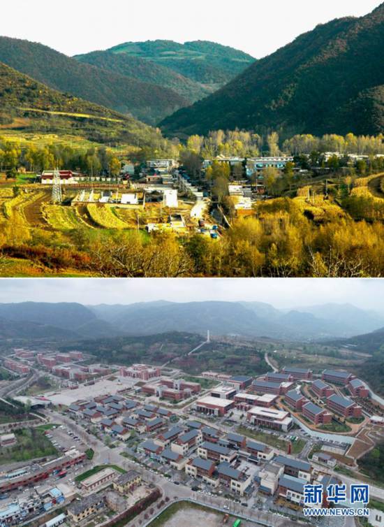 拼版照片:上圖是2005年10月23日拍攝的銅川市耀州區(qū)照金鎮(zhèn)(新華社發(fā) 石銅鋼攝)。下圖是2021年4月20日拍攝的銅川市耀州區(qū)照金鎮(zhèn)(無人機照片 新華社記者 張博文攝)。