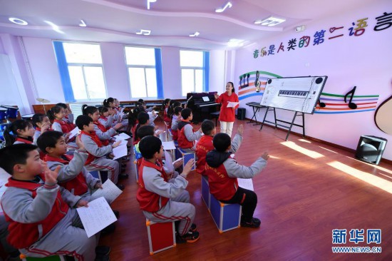 銅川市耀州區(qū)照金鎮(zhèn)北梁紅軍小學(xué)學(xué)生在上音樂(lè)課(2020年12月30日攝)。
