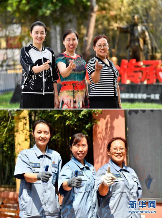 濟(jì)南市城管局城肥清運(yùn)管理一處女子清疏班在工作前(上圖)和完成作業(yè)后(下圖)合影,左起依次為董金鈴、楊琳、趙蕓(8月4日攝,拼版照片)。新華社記者 郭緒雷 攝