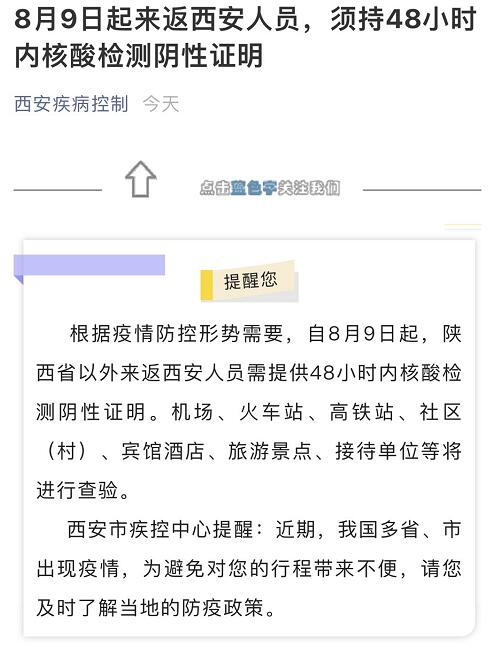 9日起陜西省以外來返西安人員,須持48小時(shí)內(nèi)核酸檢測(cè)陰性證明