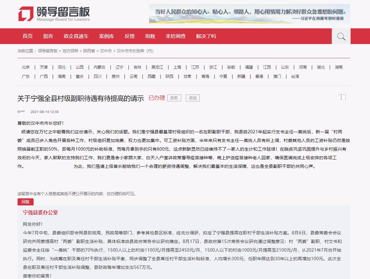 村干部留言盼調(diào)整待遇 縣委辦回復(fù):提高生活補(bǔ)貼