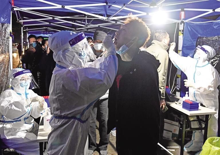 10月20日0時(shí)54分,西安市雁塔區(qū)永松路社區(qū)核酸采集點(diǎn),西安交大一附院的護(hù)士給居民做核酸檢測(cè)。本報(bào)記者 楊小兵攝