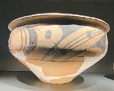 圖為廟底溝仰韶文化博物館展出的葉片紋彩陶盆。