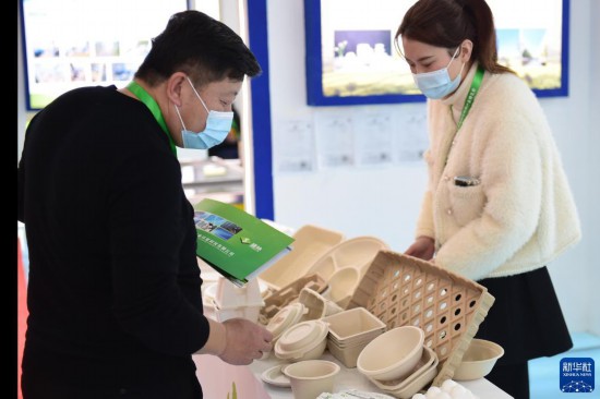 12月3日,參觀者在2021安徽秸稈暨畜禽養(yǎng)殖廢棄物綜合利用產(chǎn)業(yè)博覽會(huì)上了解一款秸稈餐具。
