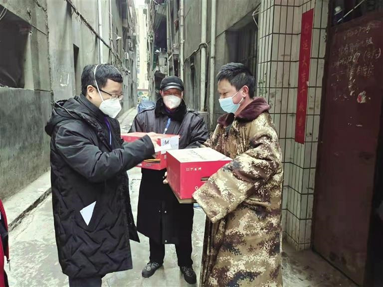 南張社區(qū)臨時(shí)黨支部的黨員上門(mén)給群眾(右一)送方便面。新城區(qū)委組織部供圖