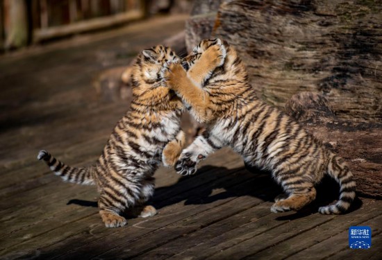 1月30日,云南野生動(dòng)物園內(nèi)的兩只東北虎幼崽在嬉戲。