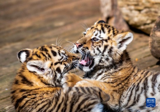 1月30日,云南野生動物園內的兩只東北虎幼崽在嬉戲。