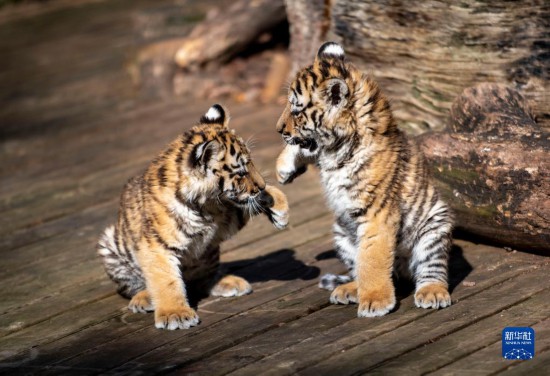 1月30日,云南野生動(dòng)物園內(nèi)的兩只東北虎幼崽在相互打鬧。