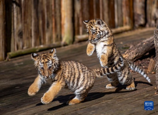1月30日,云南野生動(dòng)物園內(nèi)的兩只東北虎幼崽在相互打鬧。