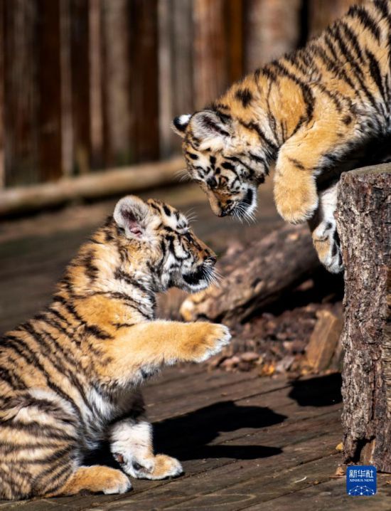 1月30日,云南野生動物園內(nèi)的兩只東北虎幼崽在嬉戲。