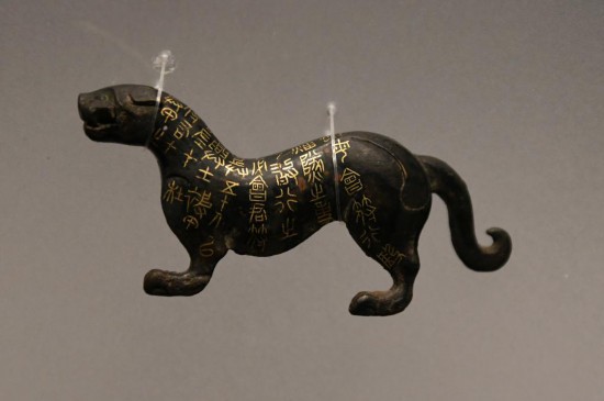 兵符是古代調(diào)兵遣將所用的憑證。它分為左右兩半,其中右半由國君掌管,左半交給軍事長官。如要調(diào)動(dòng)軍隊(duì),必須在左右兩半兵符驗(yàn)合后,才能生效。這枚杜虎符為左半符,高4.4厘米、長9.5厘米,是一只尾巴卷曲、昂首行走的老虎,其背面有槽,在老虎的脖頸處,還有一小孔。在杜虎符上,有錯(cuò)金銘文9行共40字。