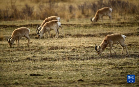 2018年4月26日,一群普氏原羚在青海省海北藏族自治州剛察縣哈爾蓋鎮(zhèn)附近的草原覓食。