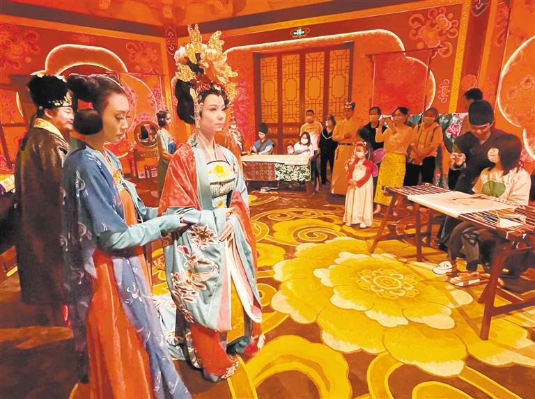 5月2日晚,西安大唐芙蓉園上演沉浸式演藝《尋夢(mèng)·芙蓉里》!拔逡弧奔倨,西安市文化旅游市場(chǎng)以形式多樣的活動(dòng),豐富群眾文化生活。 本報(bào)記者 戴吉坤攝