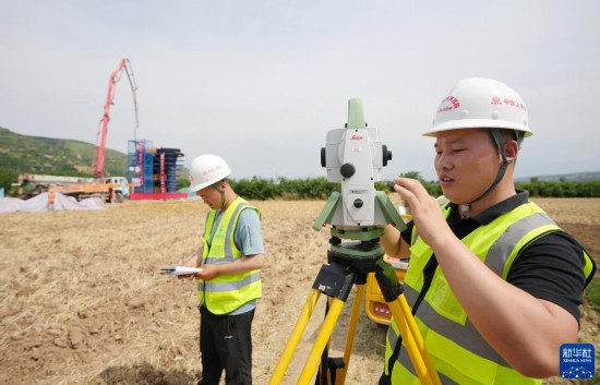 6月9日,在西十高鐵陜西段建設(shè)現(xiàn)場(chǎng),中鐵上海工程局的施工人員在澆筑橋墩前測(cè)量放樣。