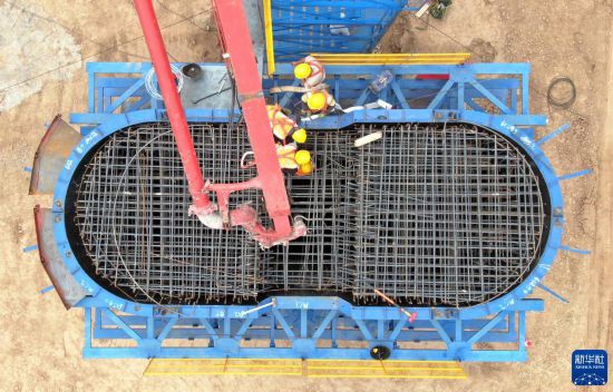 6月9日,中鐵上海工程局的施工人員在西安澆筑西十高鐵浐河特大橋13號橋墩(無人機照片)。