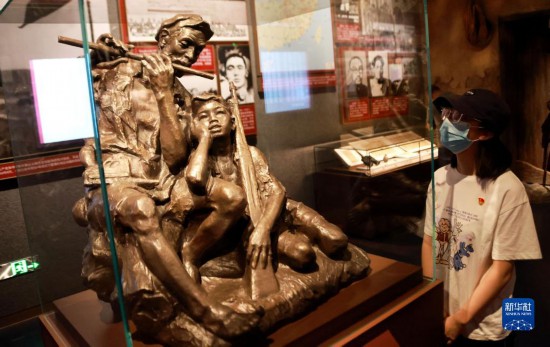 7月3日,在中國共產(chǎn)黨歷史展覽館內(nèi),一名參觀者觀看雕塑作品《艱苦歲月》。