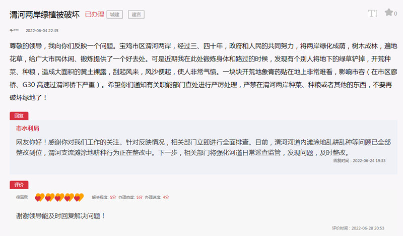 收到留言后,寶雞市水利局回復(fù)稱,針對(duì)網(wǎng)友反映情況,相關(guān)部門立即進(jìn)行全面排查。目前,渭河河道內(nèi)灘涂地亂耕亂種等問題已全部整改到位,渭河支流灘涂地耕種行為正在整改中。