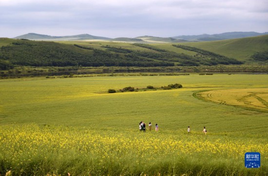 7月26日,游客在額爾古納市蒙兀室韋蘇木的油菜花田間游玩。