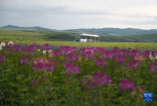 7月26日,游客在額爾古納市蒙兀室韋蘇木的花田間游玩。