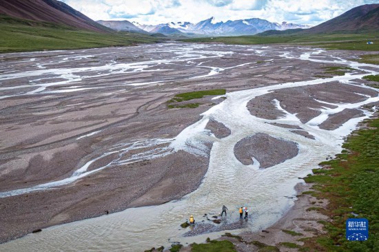 7月26日,來自長江科學(xué)院的科考隊員在長江源區(qū)采集水樣(無人機(jī)照片)。