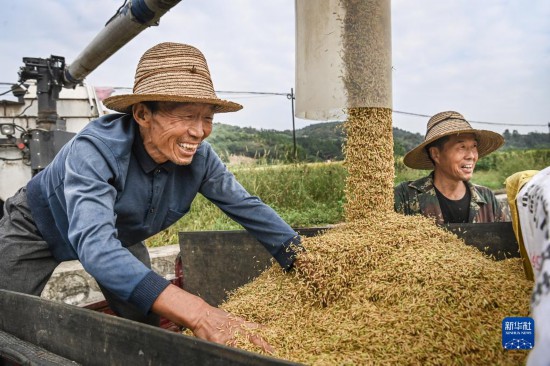 9月10日,在漢中市洋縣紙坊街道周家坎村村民在收獲稻谷。