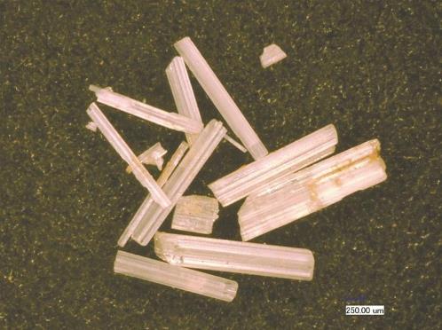 細長的針狀和棱柱狀人工合成鉛白晶體的顯微照片。 中國科學院大學考古系供圖