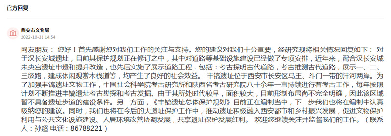 收到網(wǎng)友留言后,西安市文物局回復(fù)稱,對于漢長安城遺址,目前其保護(hù)規(guī)劃正在修訂之中,其中對道路等基礎(chǔ)設(shè)施建設(shè)已經(jīng)做了專項(xiàng)安排,近年來,配合漢長安城未央宮遺址申遺和提升改造,也先后實(shí)施了展示道路工程,包括:考古探明古代道路,考古推測古代道路,展示一、二、三級路,建成休閑觀賞木棧道等,均產(chǎn)生了良好的社會效益。