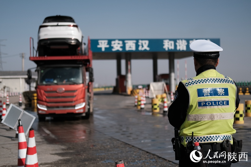 賀超和同事在西漢高速澇峪口收費(fèi)站前檢查返鄉(xiāng)車輛出行安全情況。人民網(wǎng)記者吳超 攝