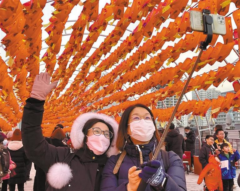 1月23日,游客在節(jié)日裝飾物前拍照留念。