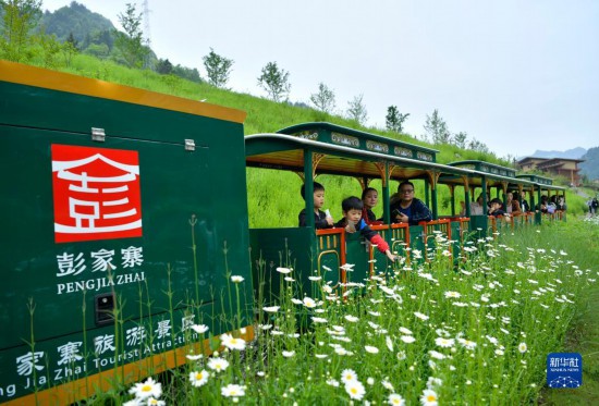 5月3日,游客在湖北省宣恩縣彭家寨古吊腳樓前體驗(yàn)“小火車(chē)”。