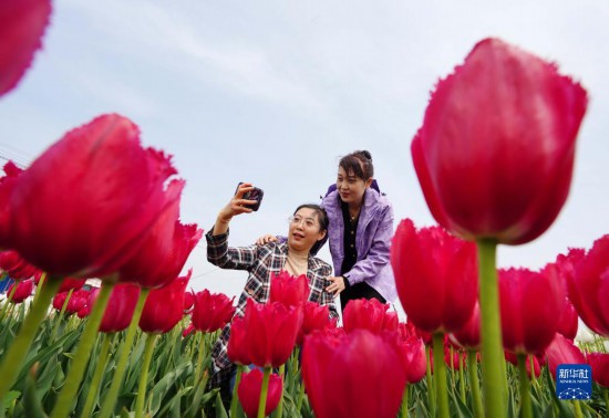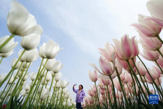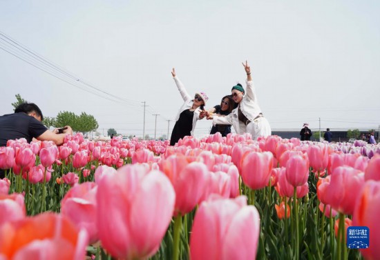 5月3日,游客在河北省灤南縣東黃坨鎮(zhèn)閆莊戶(hù)村郁金香種植基地拍照。