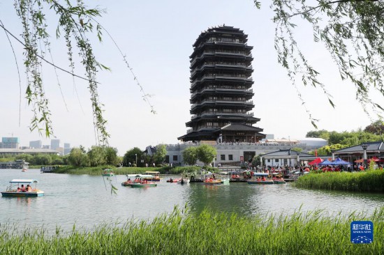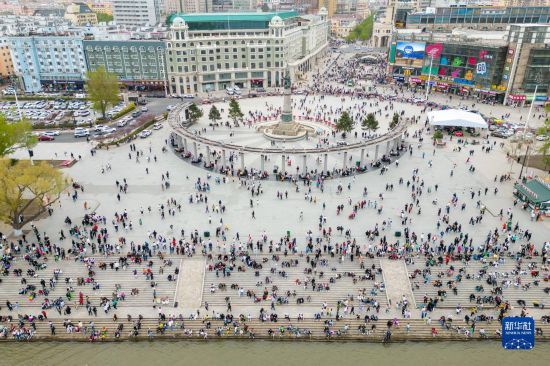 5月3日,人們?cè)诠枮I防洪紀(jì)念塔廣場(chǎng)游玩(無(wú)人機(jī)照片)。