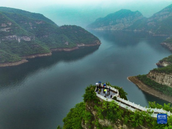 5月3日,游客在河南省濟(jì)源市黃河三峽景區(qū)游覽孤山峽景色(無(wú)人機(jī)照片)。