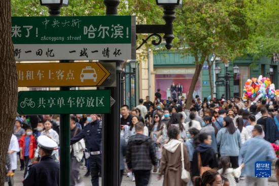 5月3日,游客在哈爾濱中央大街游玩。