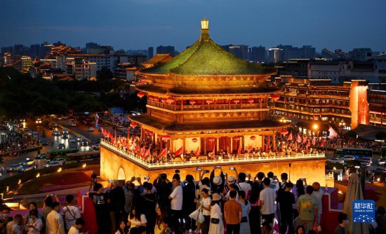 5月2日,在陜西西安,游客在觀景平臺(tái)欣賞鐘樓夜景。