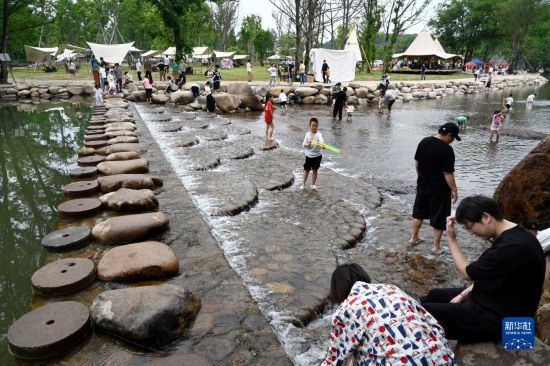 5月3日,游客在浙江省武義縣熟溪街道下嶺頭村的露營(yíng)基地游玩。