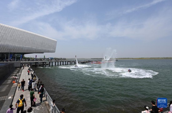 5月3日,游客在位于天津市濱海新區(qū)的國(guó)家海洋博物館室外觀看水上特技表演。