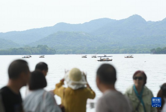 5月3日,游客在杭州西湖乘船游玩。