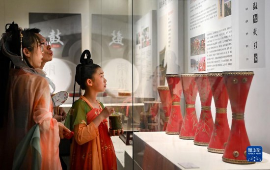 5月1日,游客在西安市鐘鼓樓博物館參觀鼓文化展。