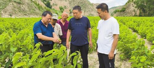 7月13日,在子長(zhǎng)市規(guī)范化桑園,畜牧產(chǎn)業(yè)鏈專(zhuān)家服務(wù)團(tuán)成員、安康市蠶桑產(chǎn)業(yè)發(fā)展中心蠶研所所長(zhǎng)陳正余(左一)給蠶農(nóng)講解技術(shù)。 本報(bào)記者 劉居星攝