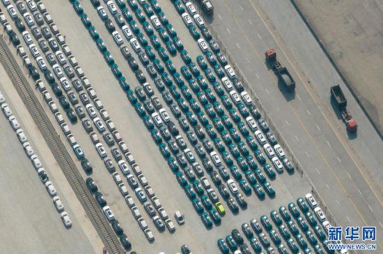 這是西安國際港站內(nèi)存放汽車的物流基地(9月7日攝,無人機(jī)照片)。