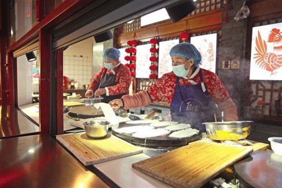 1月23日,西安市永興坊文化街區(qū)子長(zhǎng)煎餅店手藝人在攤制煎餅皮。孫亞婷攝