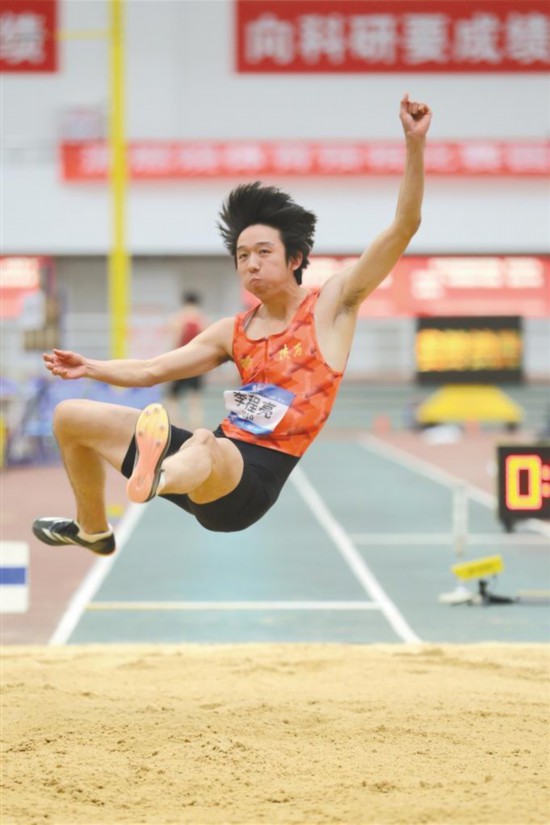 2月14日,陜西運(yùn)動員李程亮參加男子跳遠(yuǎn)項目比賽。