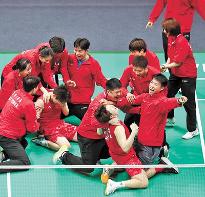 當(dāng)女雙組合劉圣書/譚寧合力為中國隊拿下制勝一分,她們激動地振臂歡呼,與沖進(jìn)場地的隊友們圍成一圈,相擁慶祝。5月4日,在福建廈門鳳凰體育館上萬名觀眾的見證下,中國羽毛球隊以3∶1戰(zhàn)勝韓國隊,連續(xù)第四次登頂。